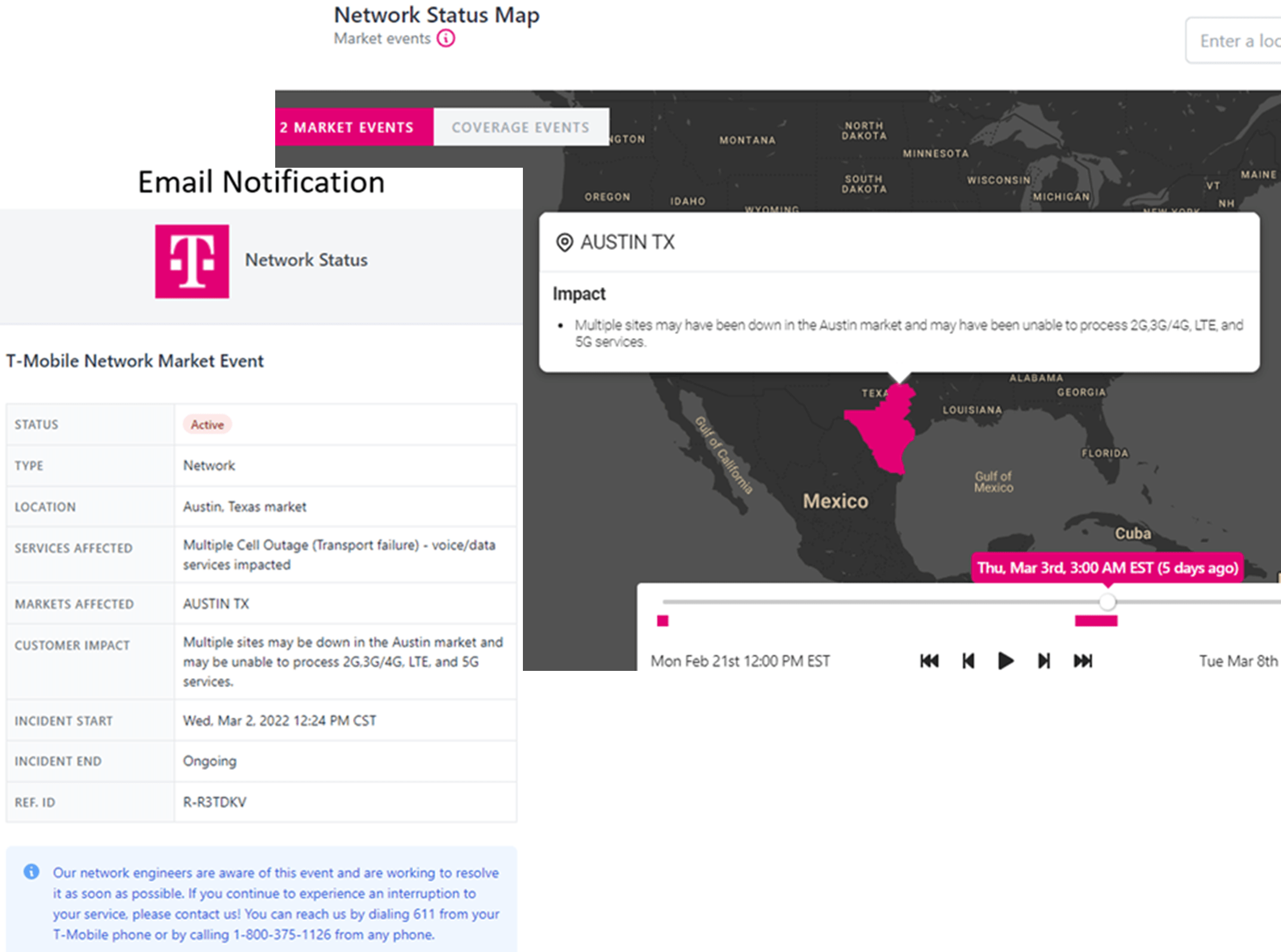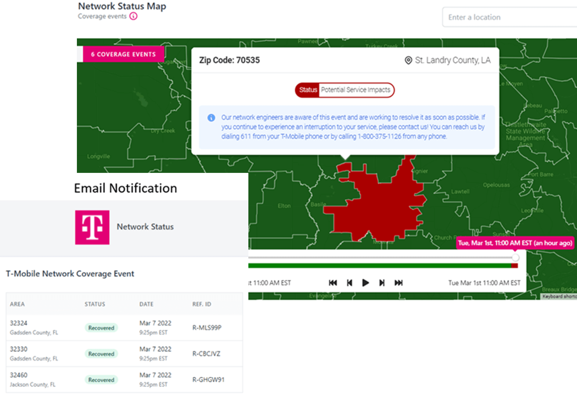 Impacted area event maps provide an overview of affected services. Subscribed customers will also receive e-mail notification of the incident or event.